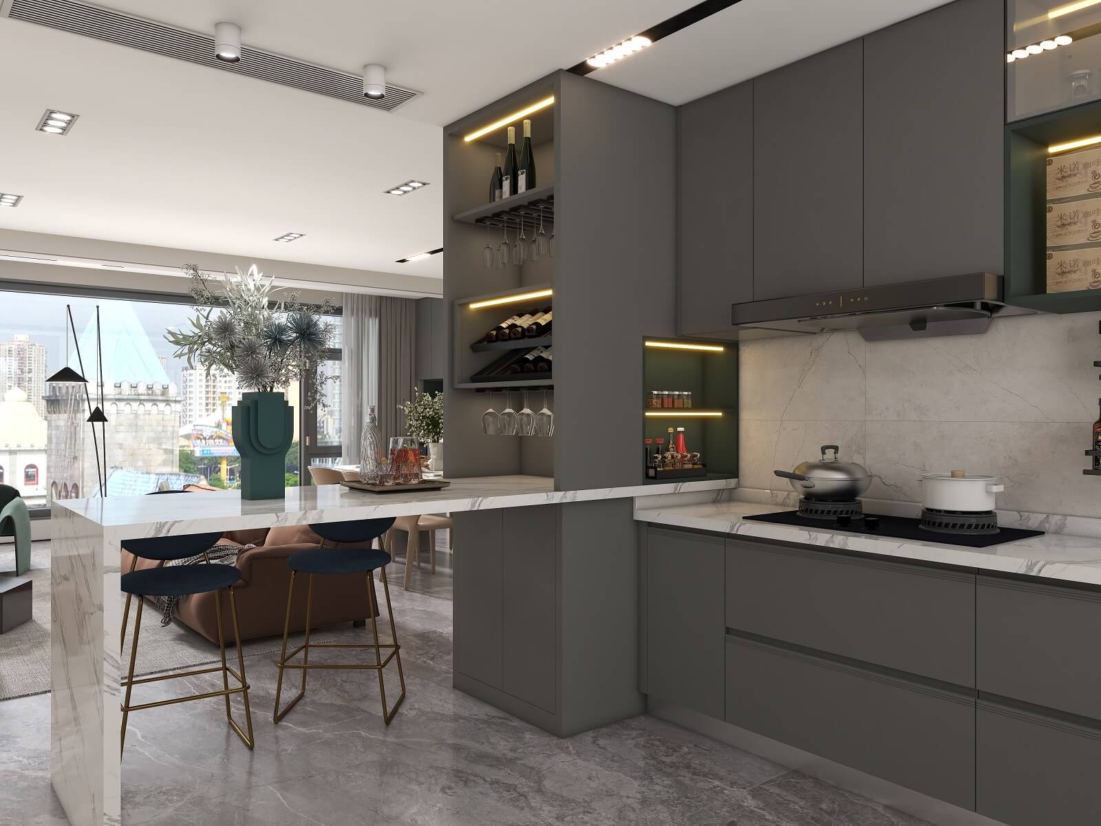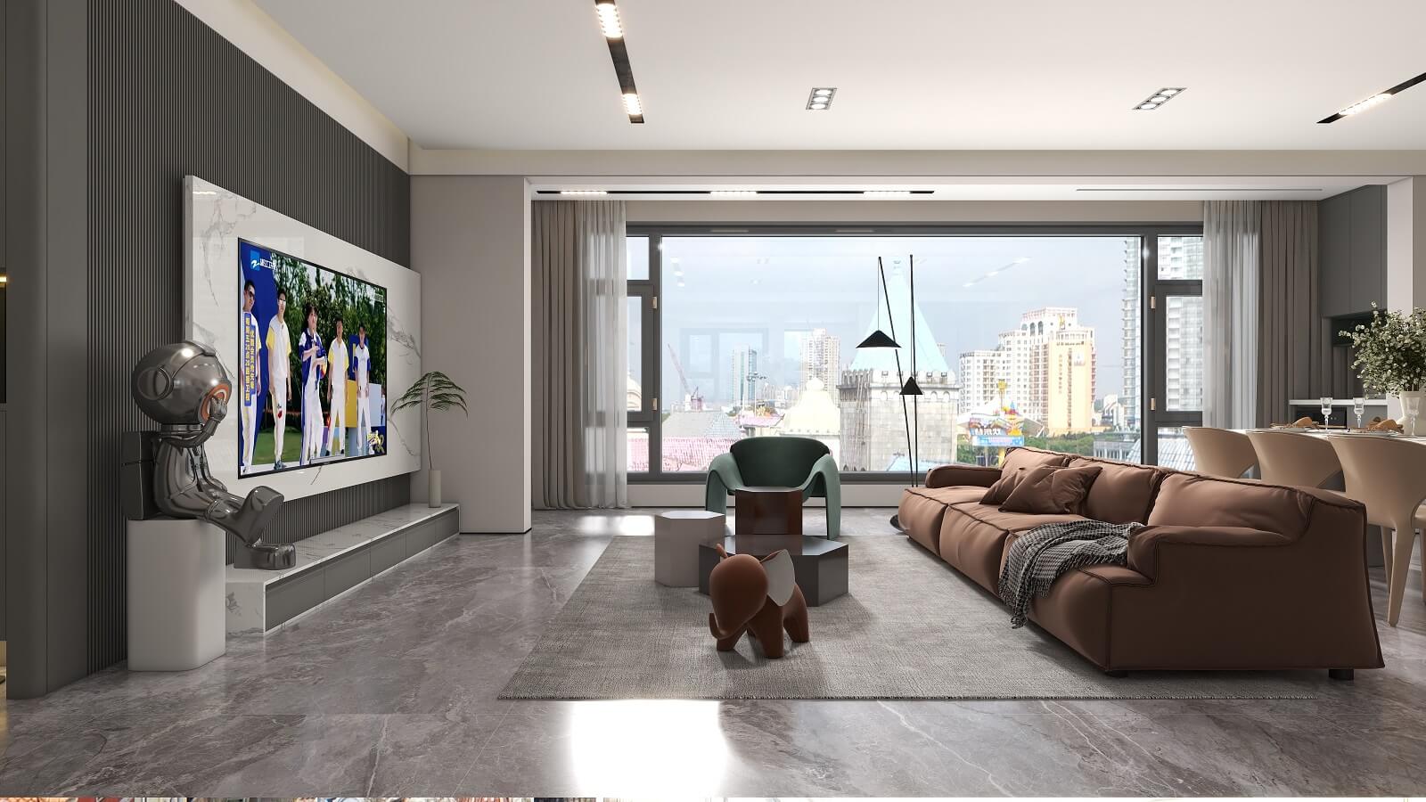 光影流動,木飾面、大理石、木格柵交織出不同層次秩序,給予空間精致質(zhì)感。