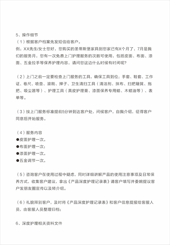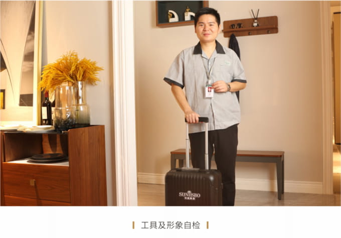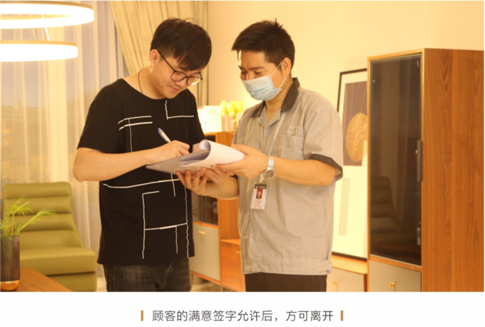 產品處理完畢后必須一站式通檢,指導客戶使用,并將服務過程中產生的垃圾隨手帶走,家具維修完畢后,應用毛巾將家具擦拭一遍,確保產品清潔。