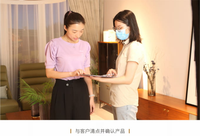 耐心解答客戶提出的關于家具保養的提問,同時將我們產品使用說明書送給客戶,爾后教客戶如何掃描產品二維碼進行防偽鑒定,請顧客對貨物進行驗收檢查,然后正式簽收《產品配送單》。
