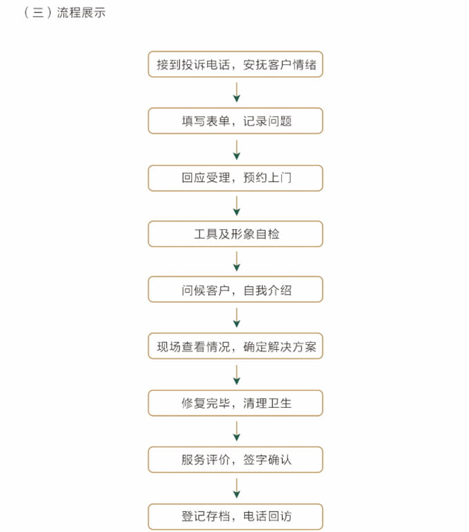 必須按照客戶約定,至少提前5分鐘上門,見到客戶時需自我介紹,并出示上崗證和名片,在進入顧客家前應穿上自備的鞋套。征得客戶同意后開始維修,嚴禁亂收費。