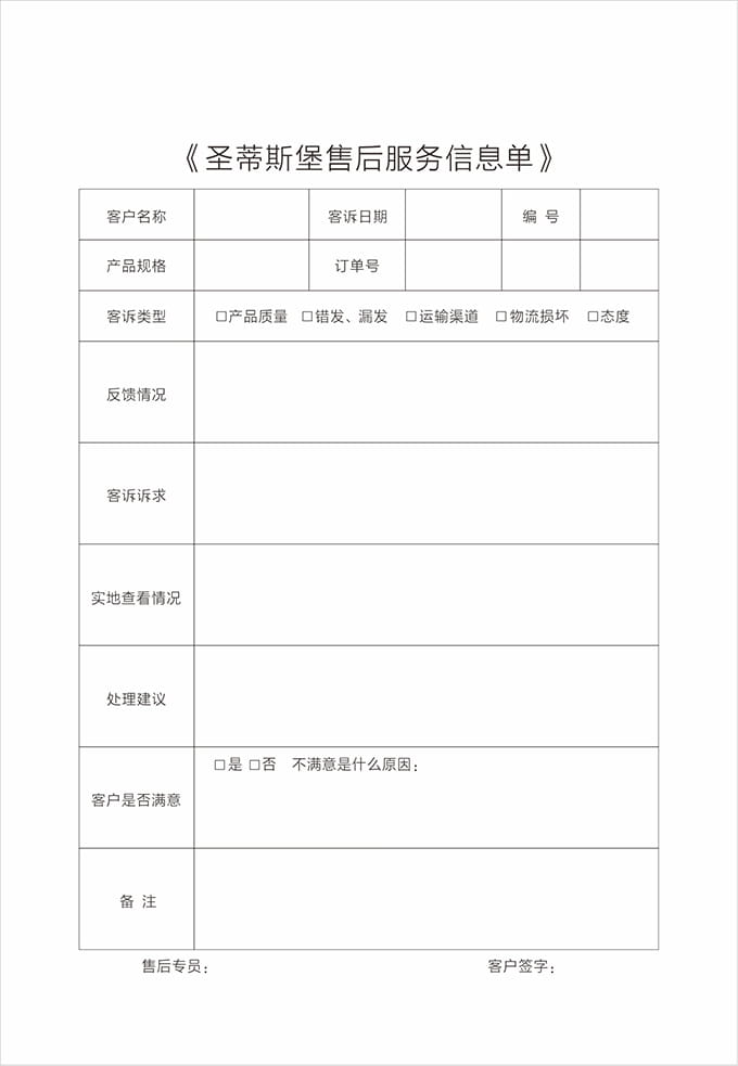 1、導購、店面、售后人員接到維修等售后問題來電時,第一時間先安撫好客戶情緒,認真傾聽客戶的問題描述,并盡量問清存在的問題和故障現象,應詳細記錄顧客名字、聯系電話、地址、商品型號、問題等信息,將這些信息登記于《售后服務跟蹤單》上后,再次確認客戶問題及訴求,看是否有遺漏,確認無誤后回復客戶多長時間給他答復;